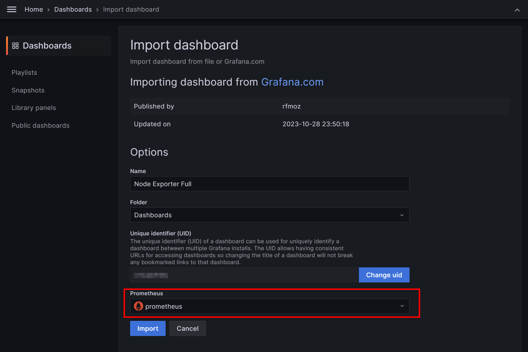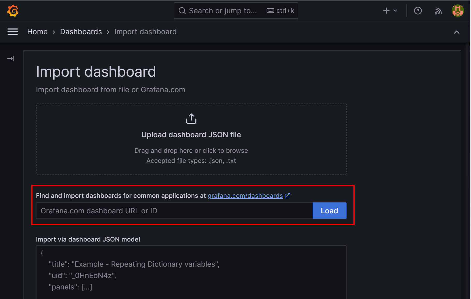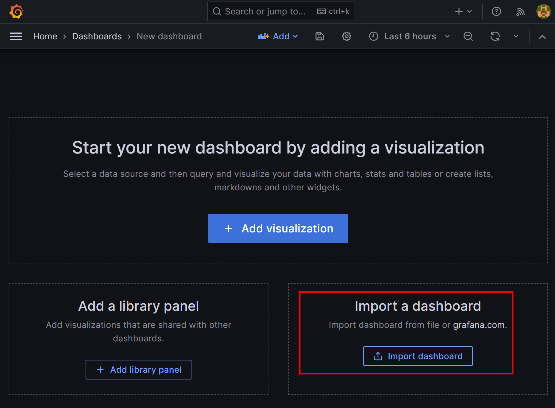 Home > Dashboards에서 Create Dashboard > import Dashboard