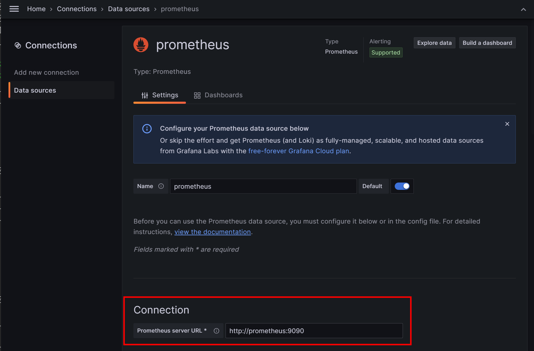Home > Connections > Data Sources에서 default로 존재하는 prometheus에 들어가 Connection 주소를 Prometheus 서버의 URL로 설정해준다.